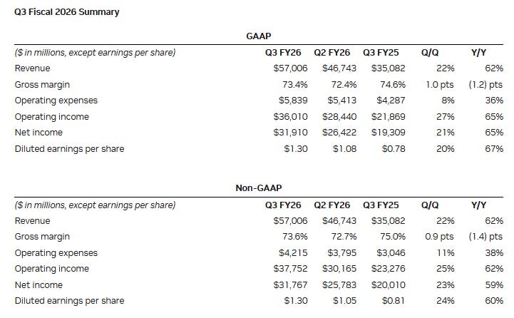 Nvidia delivered another historic quarter with results and guidance that crushed sky high expectations. Nvidia reported $57B in revenue this quarter, +62% YoY, and raised Q4 guidance to $63.7B–$66.3B. Data center revenue reached $51.2B +66% YoY, showing that demand for accelerated computing is still growing faster than supply. Net income jumped to about $32B +65% YoY, and gross margins came in at a massive 73.4%. These are numbers that most software companies don’t even achieve, yet this is a hardware company. Nvidia is operating a hardware, networking, and software ecosystem with profit metrics similar to cloud SaaS. It’s just unheard of.