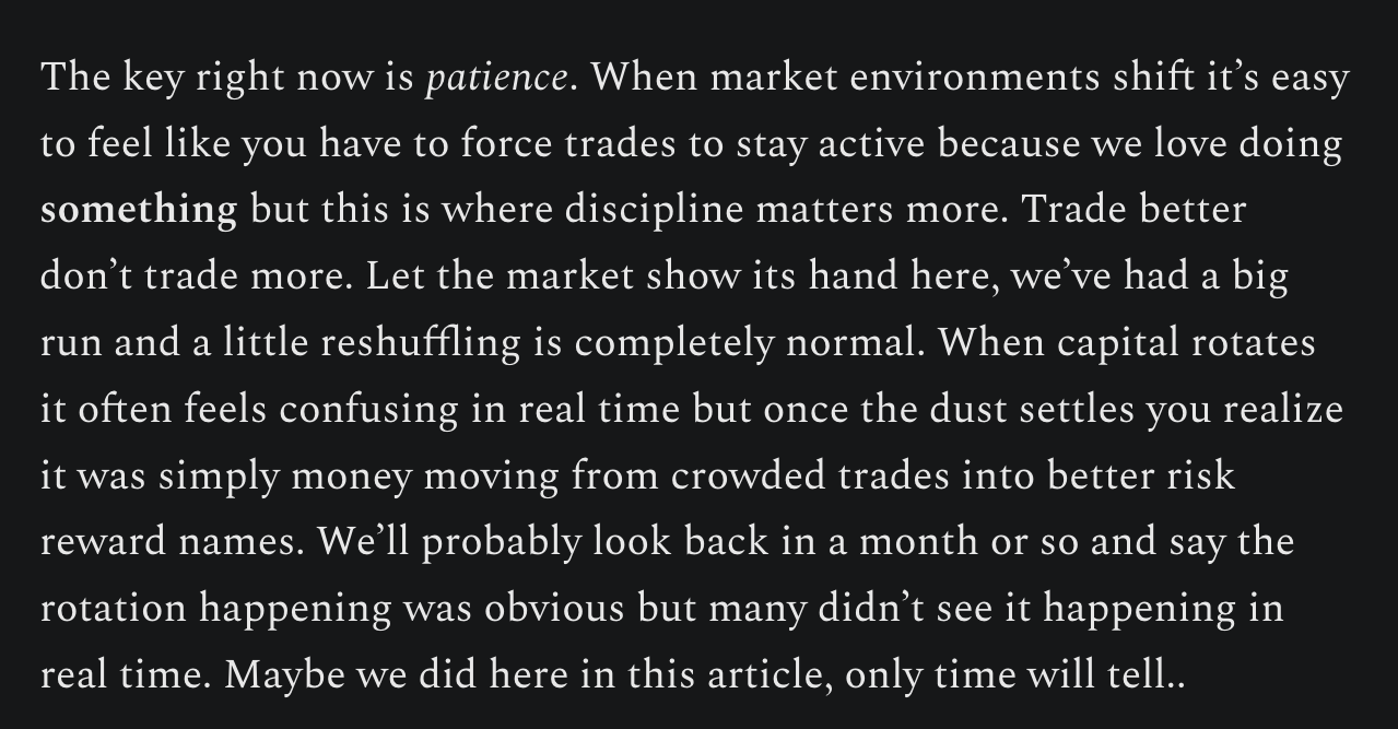 My plan is to release one of these each week. I’ve got a long list of topics lined up including what to look for when analyzing a companies fundamentals, combining technicals/fundamentals/thematics/narratives into a trade, the psychology of trading, how philosophy fits into the mindset of a trader, how to effectively use moving averages, identifying ideal entries during uptrends, and more. I have received very positive feedback on these pieces thus far so I suggest checking them out if you haven’t already. If there’s something specific you’d like me to cover, drop it in the comments, I read everything and I want these to be useful. The goal with this series is to build something long lasting that helps all of us trade better, think sharper, and approach the market with more discipline.