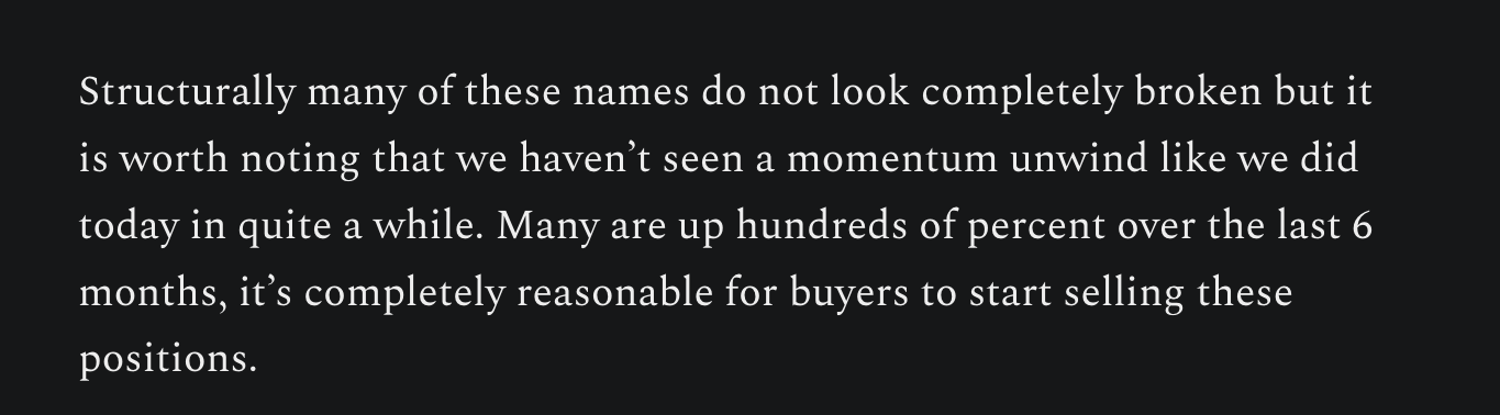 The environment we’re potentially pausing was a wild one. In certain markets you can get away with chasing and still make money. You’ll buy something extended, it’ll go higher, and you’ll get lucky. But that type of market creates bad habits. You have to be aware enough to recognize when the environment changes. I think that change might be happening at least temporarily. You can’t be as loose and willy nilly in this type of market. If you miss your entry just move on or wait for it to set up again. A few weeks ago you could just chase something high because it would probably end up going higher. Not anymore. You need to be a lot more careful now than you were a month ago.