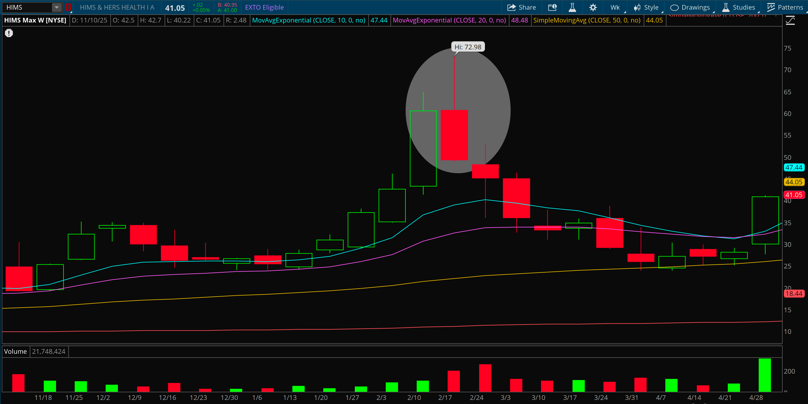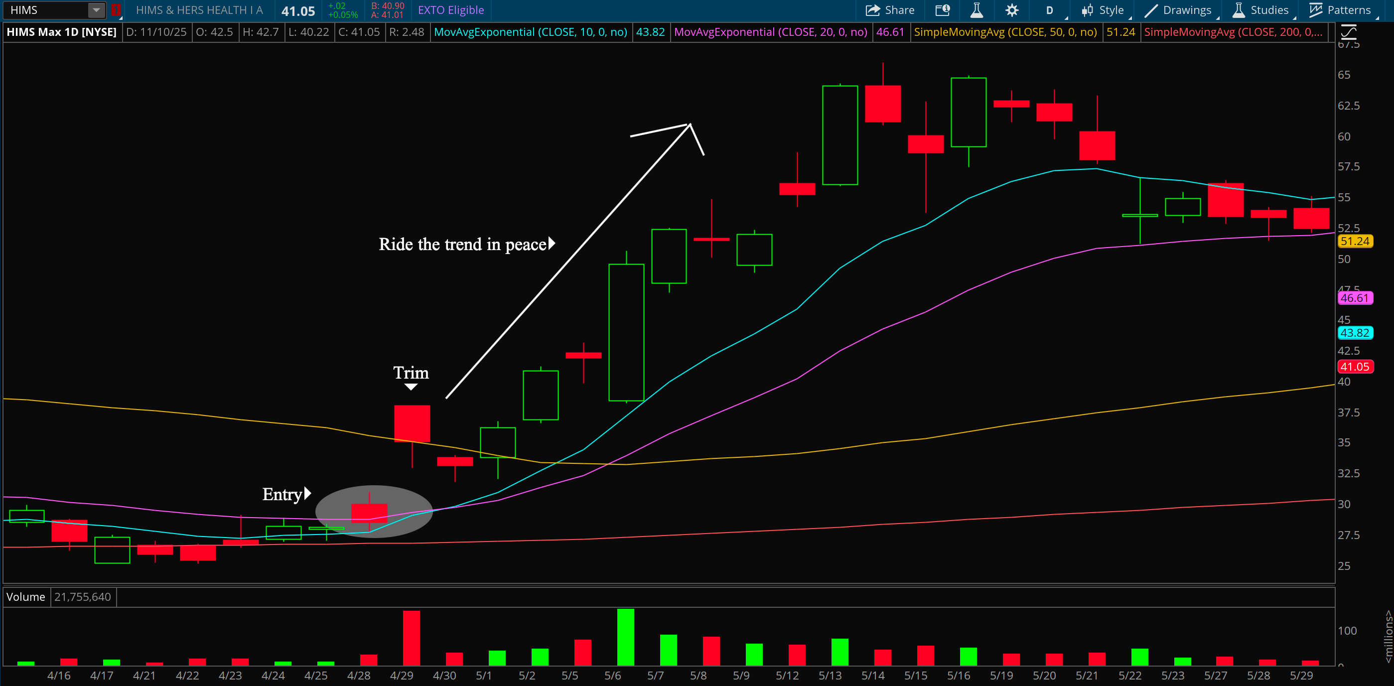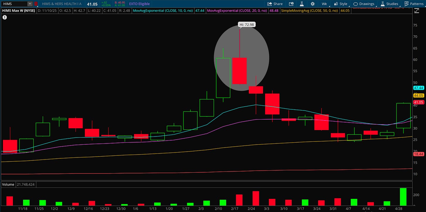 This was one of my best trades of the entire year. I got very lucky with this entry, I can’t deny that. I had been watching Hims base for weeks and once it closed over both the 10 and 20 day moving average, I took an entry. The next day it ripped 35% after a deal with Novo Nordisk. I was also watching the weekly chart and it happened to be basing right against the 50 week, that was the big signal I used to buy.