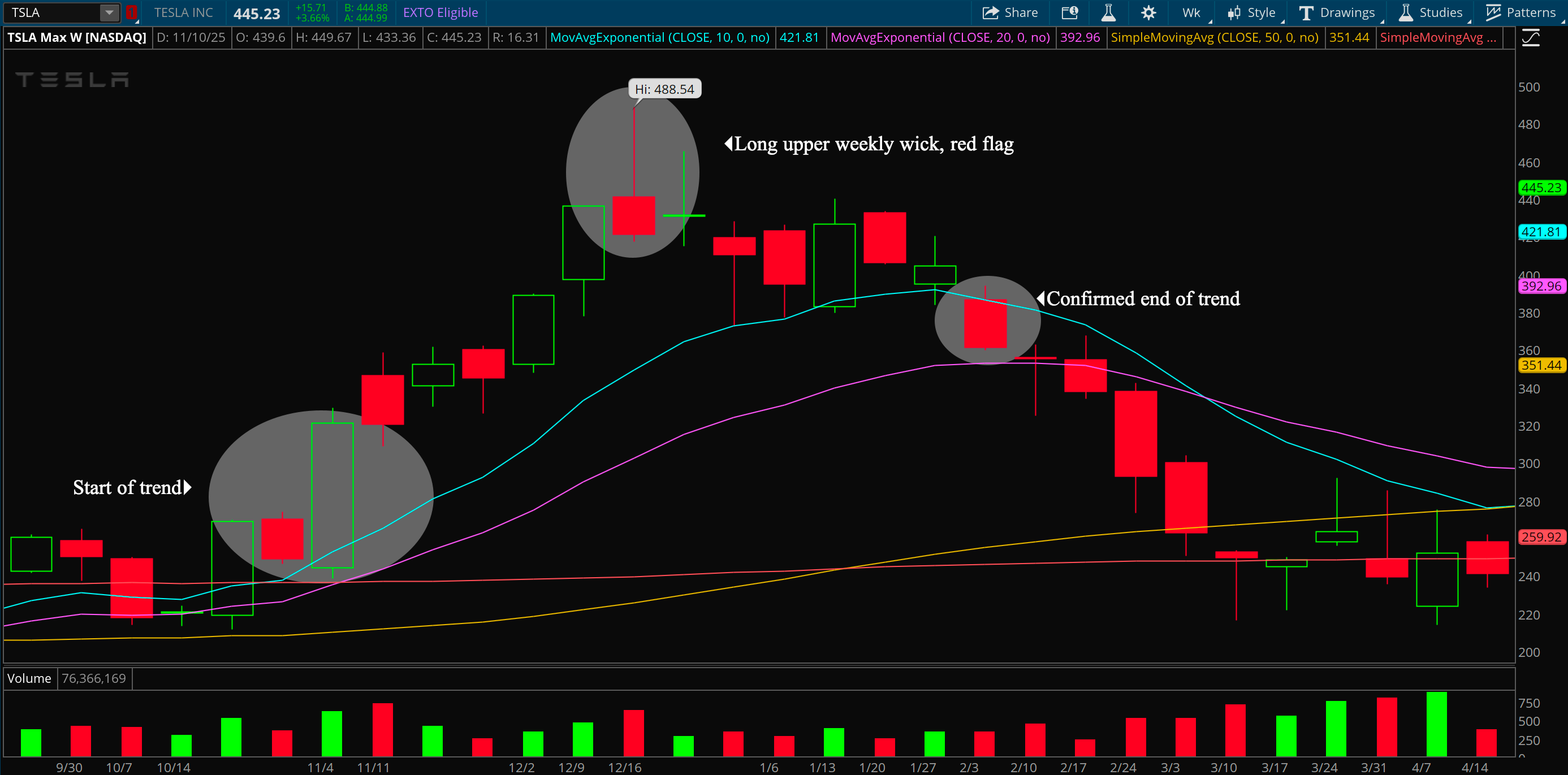 When a stock that’s been trending strong finally closes below its 10 or 20 week EMA, that’s the first major signal momentum is slipping. I call these moving averages guardrails during a healthy uptrend. They essentially act as clean support areas that should not be broken. The strongest trending names ride these moving averages for weeks or even months as buyers consistently step in around them. Once the stock starts closing below those levels on the weekly, it’s a red flag.