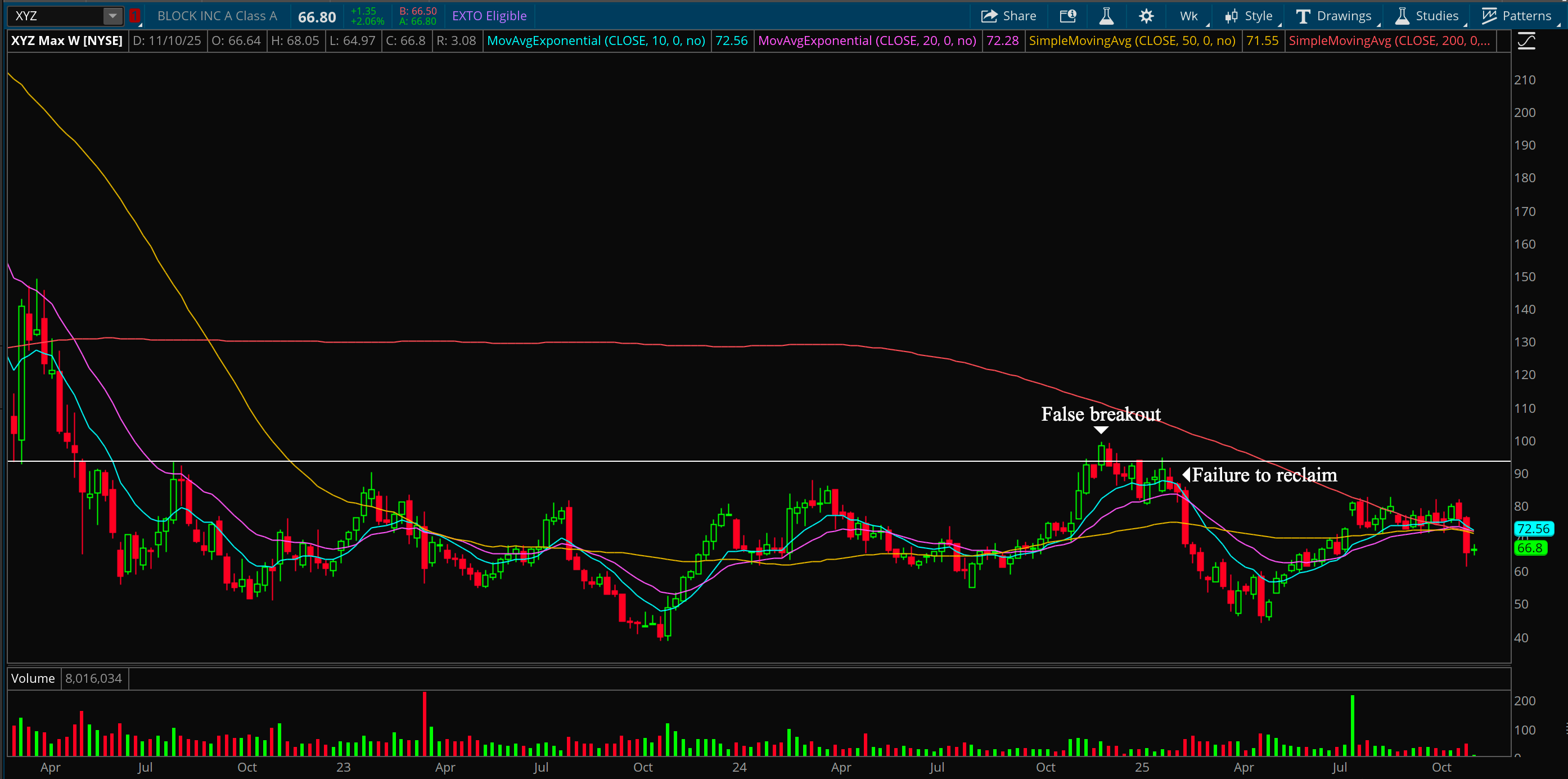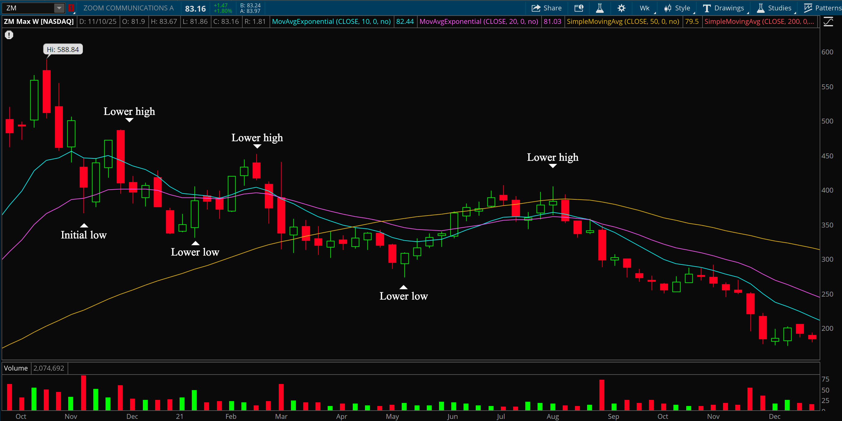 You can see this chart on Zoom, it’s textbook. The second lower high was the time to get out, it was very clear what was happening here. Especially because the moving averages all got clustered and messy but that’s a post for another day. If I was in Zoom, I would have been out the week after the lower high. That week it also happened to close below the 10/20 week moving averages.