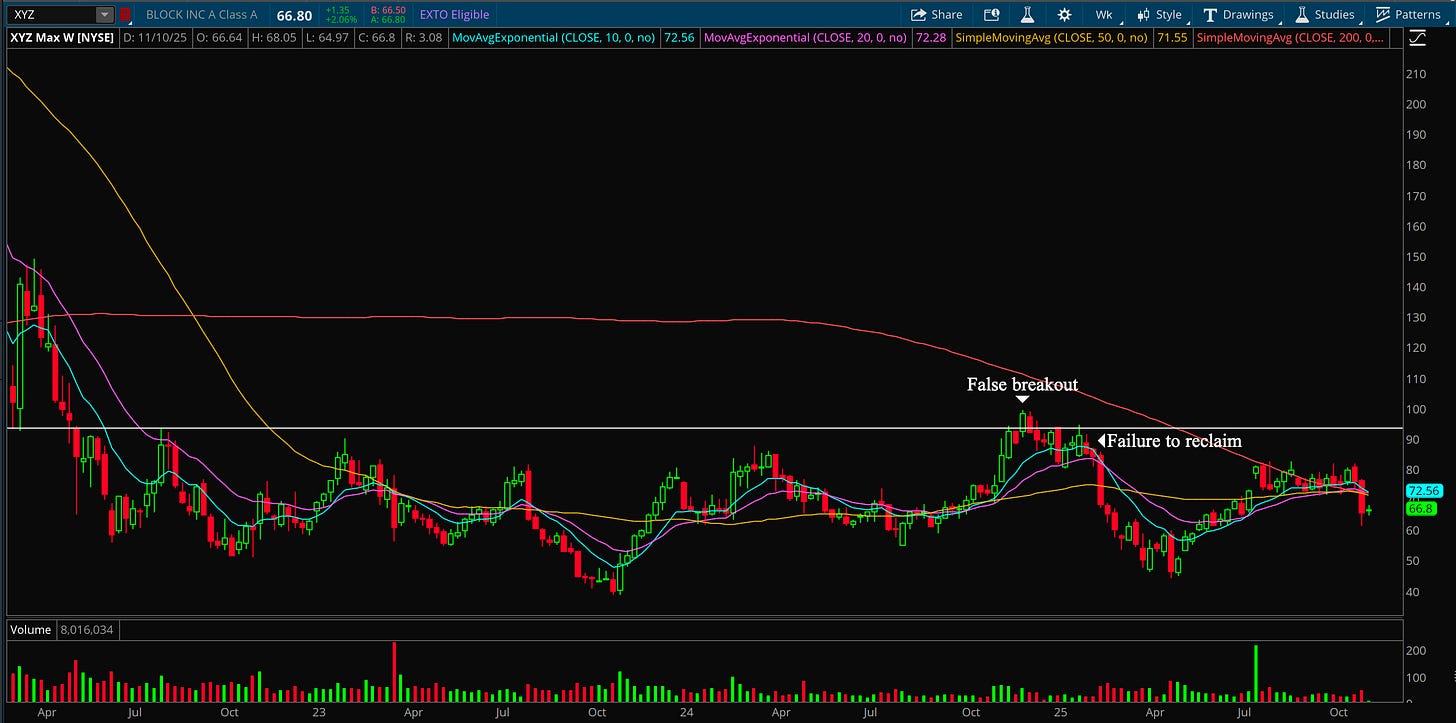 When a stock breaks out of a base it’s often a buy signal. When it shows a false breakout, that shows breakout buyers are trapped and a new level of resistance was formed. Or bagholders so to speak. When price closes below a breakout area on the weekly chart, the means breakout failed. The buyers who came in at that level are now underwater and that shift in psychology can flip the chart completely. Those same buyers likely turn into sellers on bounces into that range and that change in behavior can kill an entire move.